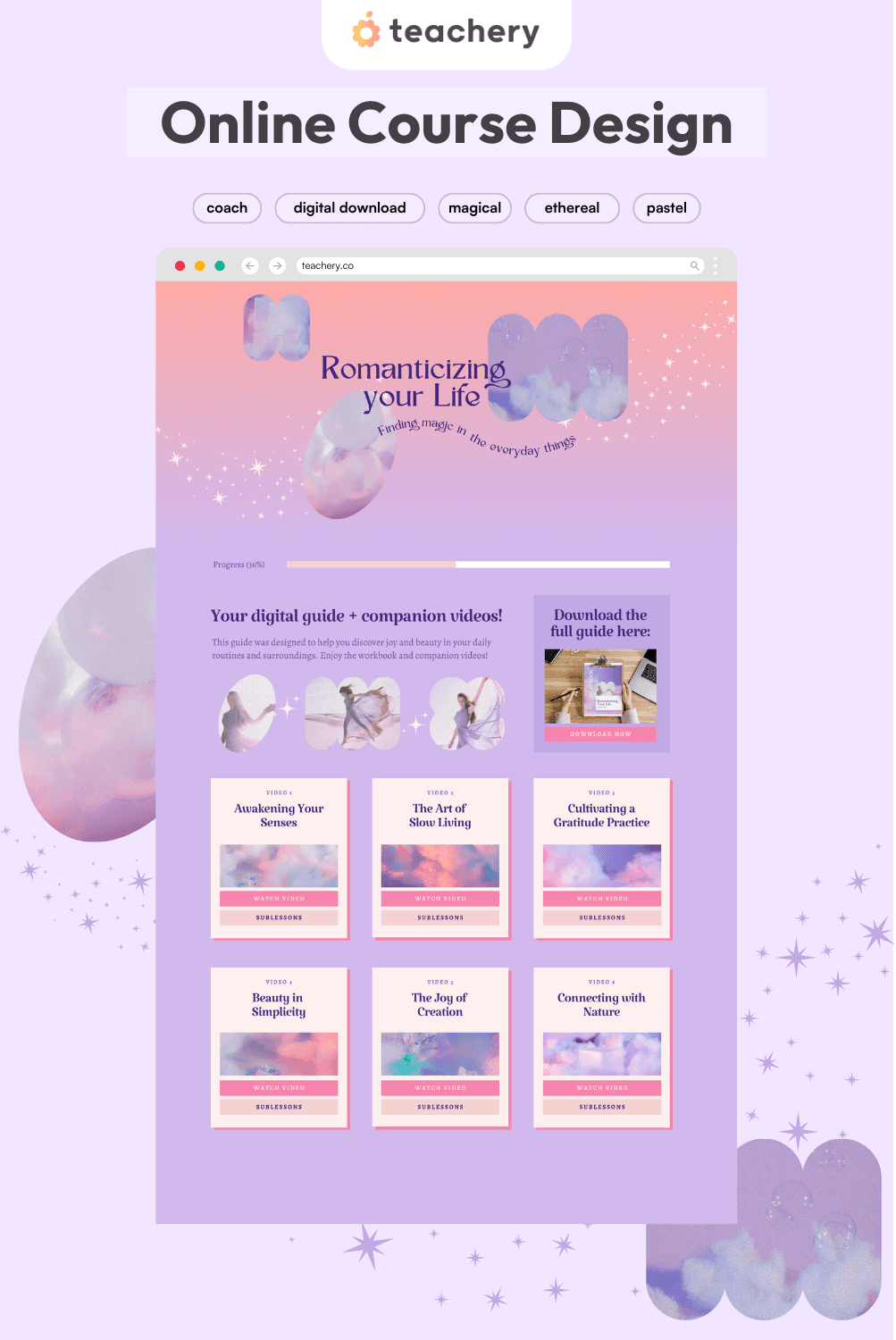 Design your Teachery digital products and online courses in a fraction of the time with this Canva Kit! Comes with template courses for you to customize, color palettes, font pairings, alternative card layouts and example courses to inspire you!